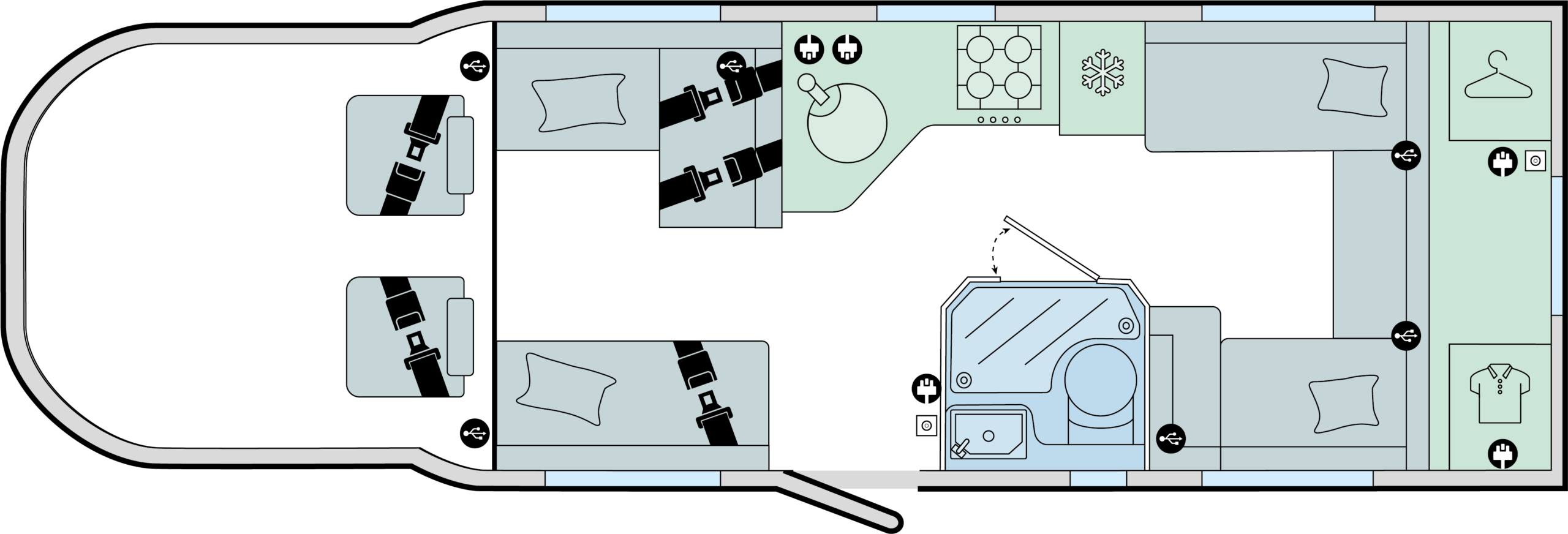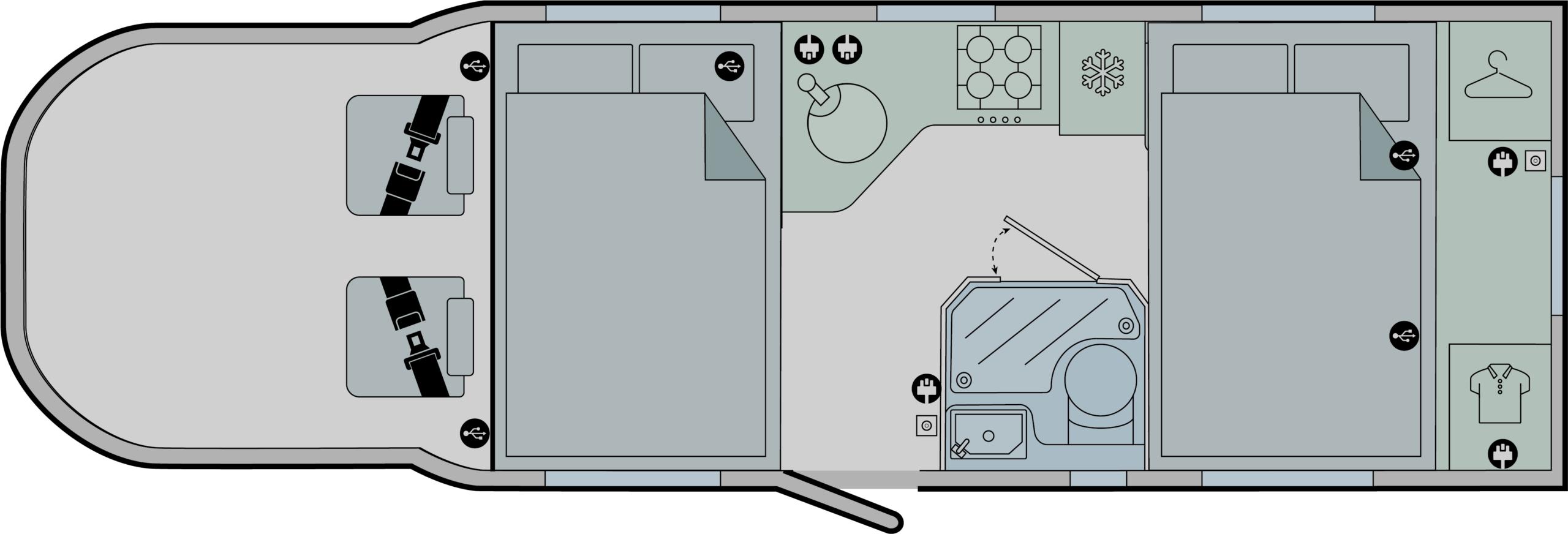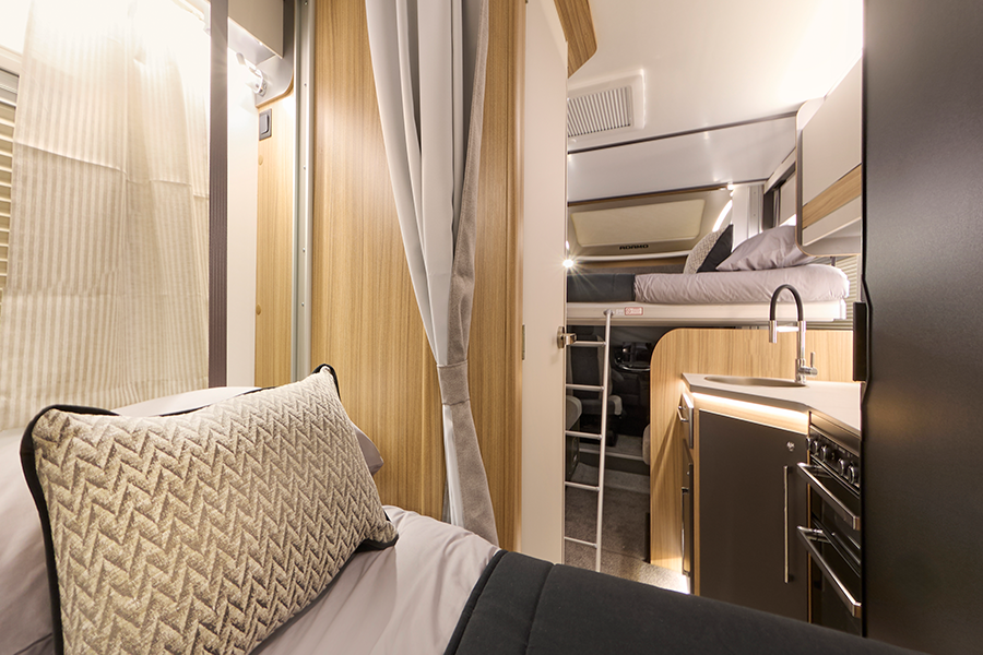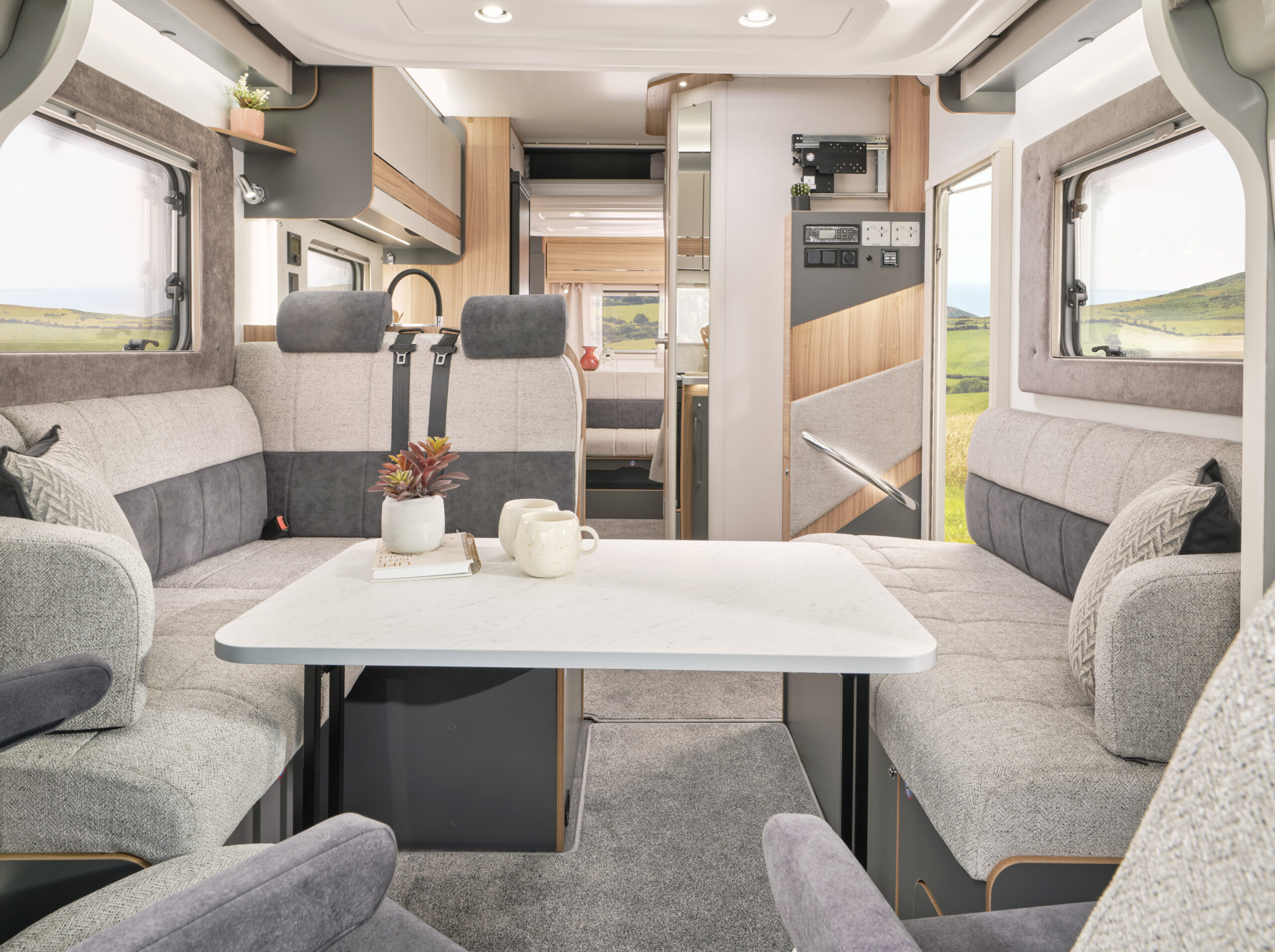 The Adamo XLDL offers a bright and modern interior designed for comfortable touring. The well-thought-out layout provides excellent separation between living, sleeping, and washroom areas, making it ideal for family use. The electric drop-down beds offer flexible sleeping arrangements while preserving daytime living space.